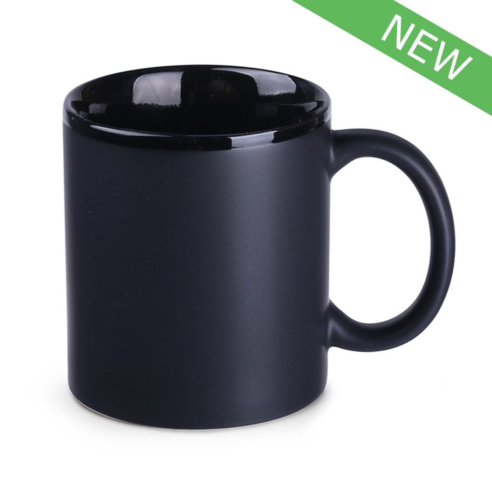 La tazza promozionale che combina la forma classica con il moderno smalto satinato. Il look moderno è dato dal bordo nero lucido.